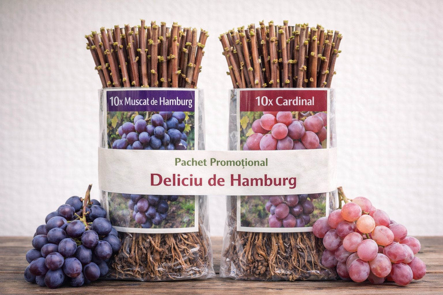 Deliciu de Hamburg este combinația ideală între eleganța aromatică a soiului Muscat de Hamburg și forța productivă timpurie a soiului Cardinal. Acest pachet oferă echilibru perfect între gust intens Muscat și struguri mari timpurii, fiind ideal pentru consum proaspăt și grădini productive.