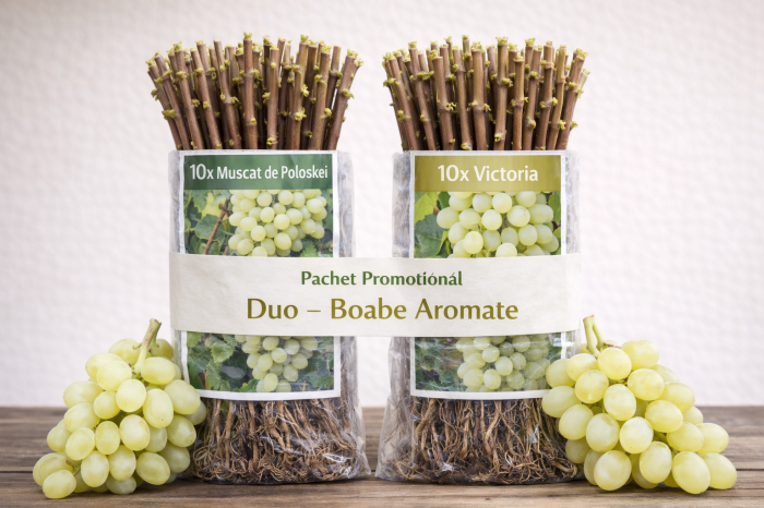 Duo-Boabe Aromate îmbină performanța soiului românesc Victoria – recunoscut pentru strugurii mari și aspectul comercial excelent – cu exotismul aromatic al Muscat de Poloskei, un soi alb productiv cu parfum Muscat intens. Pachet ideal pentru consum proaspăt și vinuri aromate.